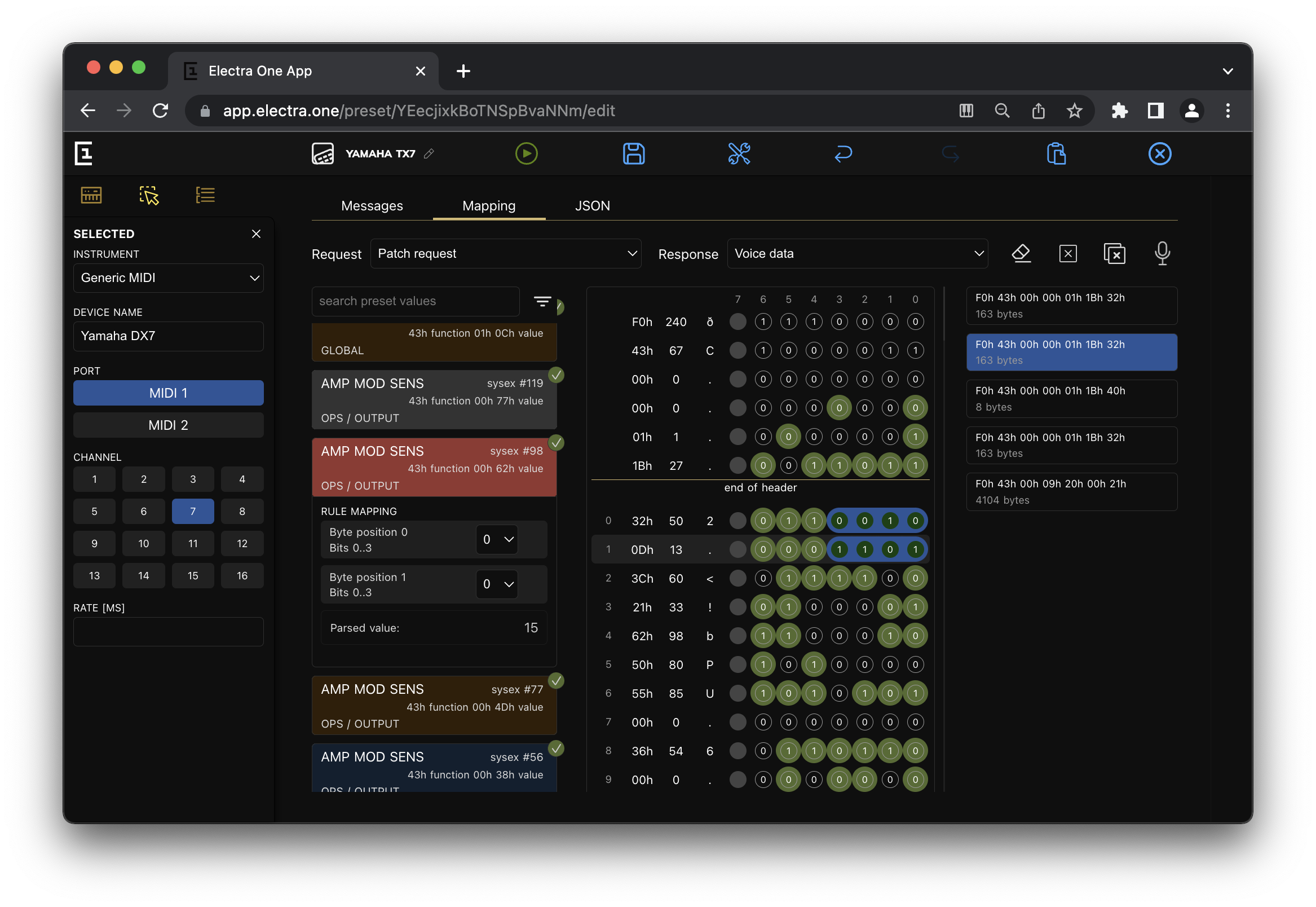 Once the requests and responses ared defined, you can interactively communicate with the MIDI device and observe the incoming messages. The Patch editor will automatically mark changing bits and bytes, allowing you to locate the parameters in the stream of the MIDI data. Assigning the parsed values to the preset controls is just a matter of a few mouse clicks.