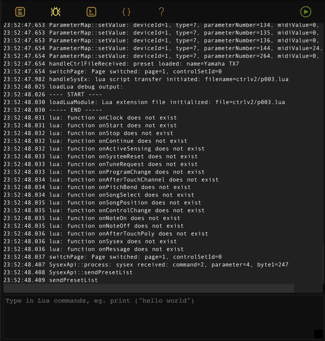 The Lua debugger gives you an easy way to develop, test, and debug your Lua scripts efficiently. The log window above the command prompt provides info from the controller.