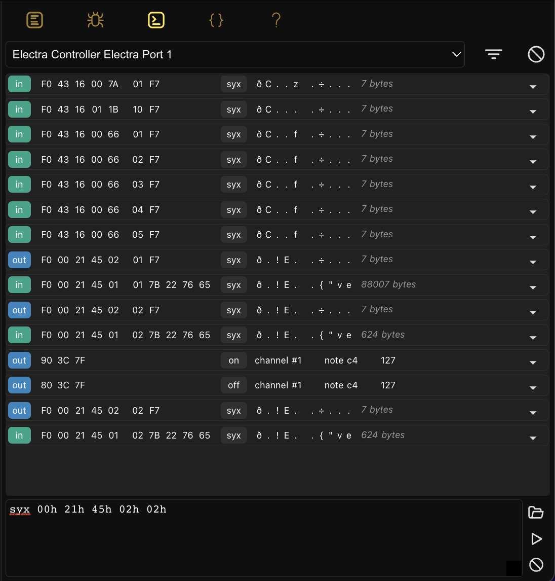 Communicate with your gear interactively by sending and monitoring MIDI messages. MIDI console accepts MIDI commands in syntax inspired by the Sendmidi tool in raw dec/hex format.